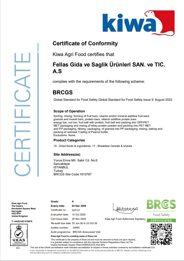 Kalite, sağlık, yenilik ve lezzet önceliklerimiz doğrultusunda üretim yapıyor; süreçlerimizi ve ürünlerimizi BRCGS (Global Standard for Food Safety Global Standard for Food Safety ) sertifikası ile uluslararası standartlara uygun şekilde güvence altına alıyoruz.