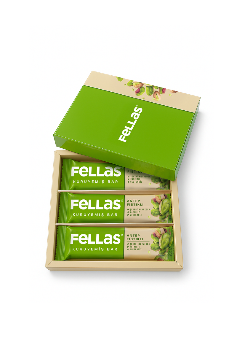 Fellas Antep Fıstıklı Kuruyemiş Bar, %75 antep fıstığı içeriğiyle, koruyucu ve katkı maddesi içermez. Spor öncesi, kahve yanında veya ara öğünlerde pratik bir alternatif sunar.