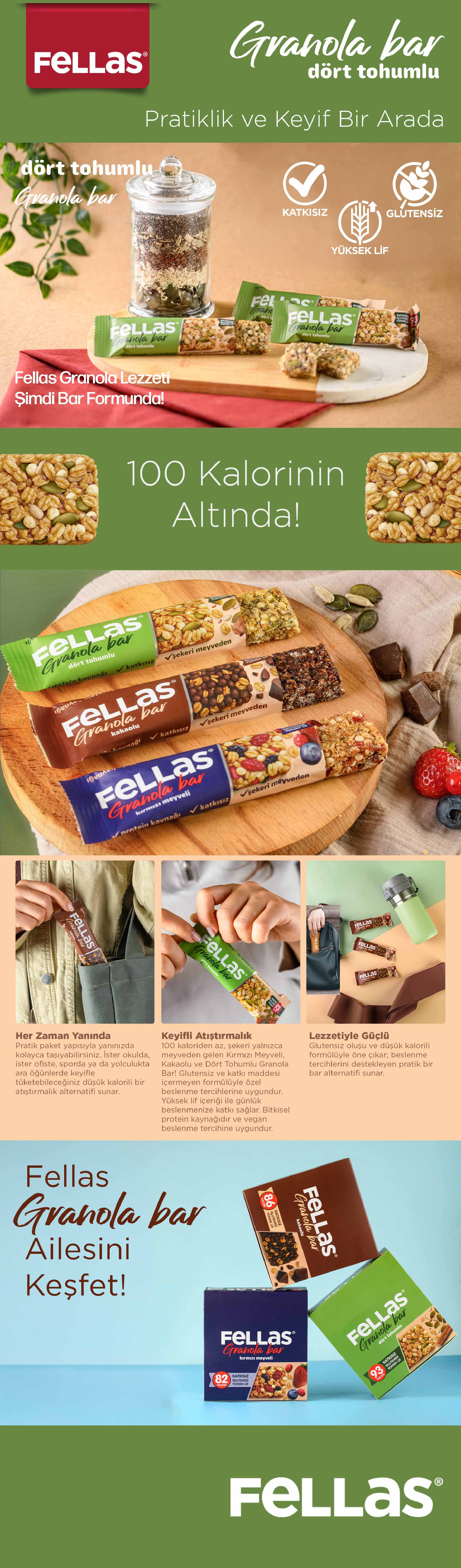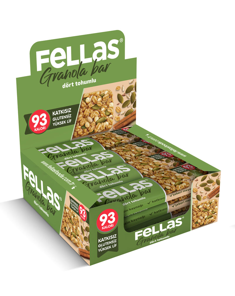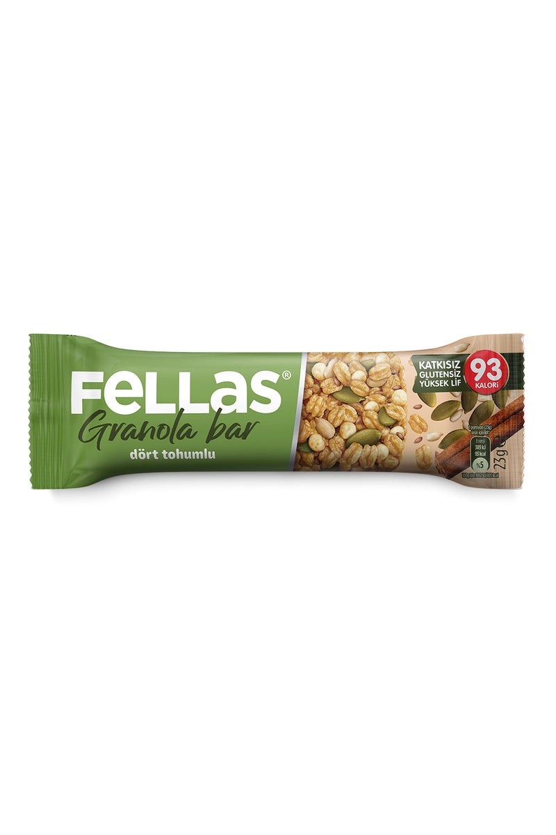 Fellas Dört Tohumlu Granola Bar; ay çekirdeği, chia, keten tohumu, kabak çekirdeği ile zenginleştirilmiş granola karışımıyla hazırlanır. Şekeri yalnızca meyvelerden gelir ve her lokmada dört tohum aromasını hissettirir. Aynı zamanda protein kaynağıdır.