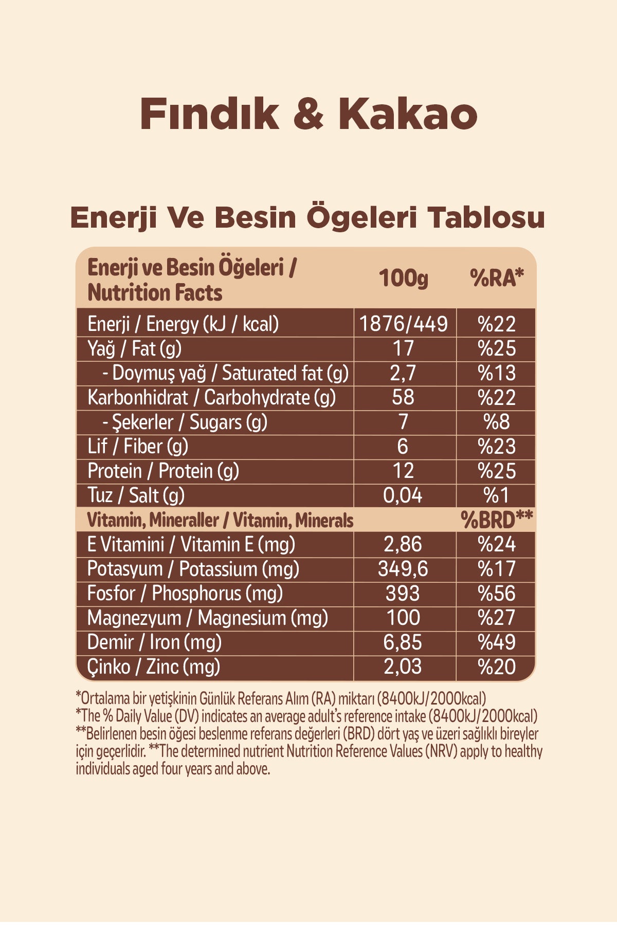 - Fındıklı ve Kakaolu: Yulaf ezmesi(%58,4), hurma suyu konsantresi(%18,2), fındık (%13), zeytinyağı(%6,5), pirinç unu, kakao kitlesi (kakao yağı, kakao tozu)(%0,9), kakao tozu (%0,7).
