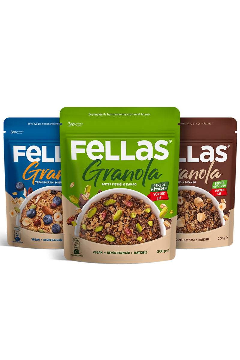 Fellas Granola, sabah öğünleri ve ara öğünler için pratik ve lezzetli bir alternatif sunar. Karışık Kuruyemiş Kakao, Antep Fıstıklı Kakao, Fındık Kakao, Kırmızı Meyveler, Hindistan Cevizli Kakaolu, Yaban Mersinli gibi çeşitli seçenekleriyle her damak tadına hitap eder. Katkı maddesi içermeyen ve şekeri sadece meyveden gelen formülüyle, günlük dengeli beslenme rutininize kolayca uyum sağlar.