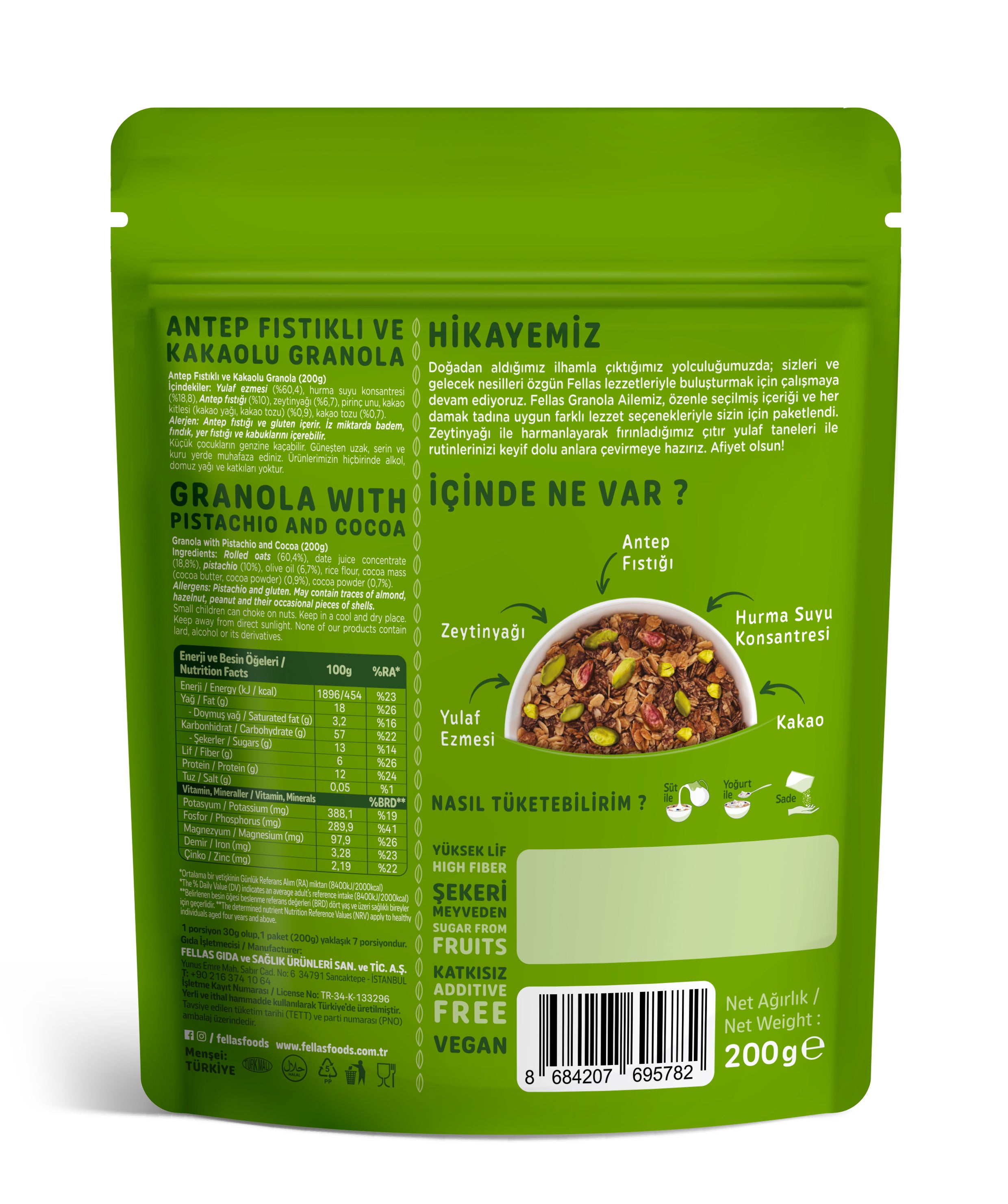 Fellas Granola, hurma suyu ile doğal olarak tatlandırılmıştır. Vegan beslenmeye uygundur.