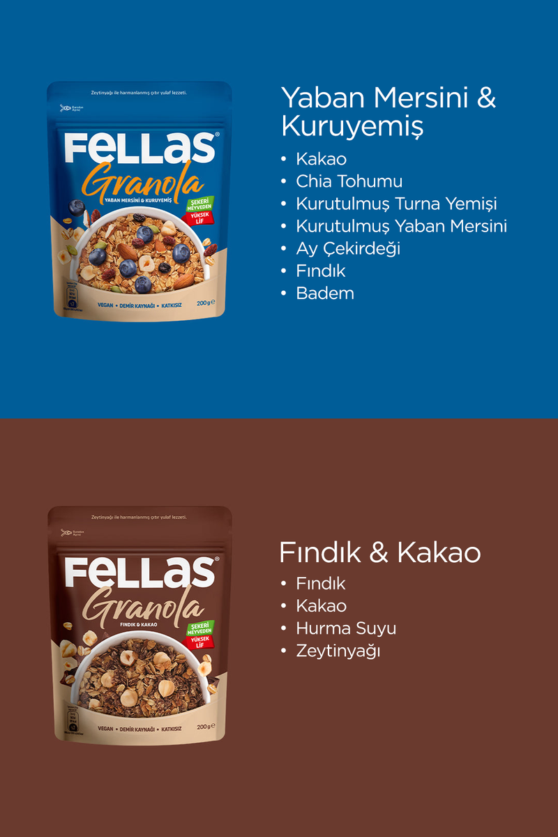 Fellas Granola, sabah öğünleri ve ara öğünler için pratik ve lezzetli bir alternatif sunar. Karışık Kuruyemiş Kakao, Antep Fıstıklı Kakao, Fındık Kakao, Kırmızı Meyveler, Hindistan Cevizli Kakaolu, Yaban Mersinli gibi çeşitli seçenekleriyle her damak tadına hitap eder. Katkı maddesi içermeyen ve şekeri sadece meyveden gelen formülüyle, günlük dengeli beslenme rutininize kolayca uyum sağlar.