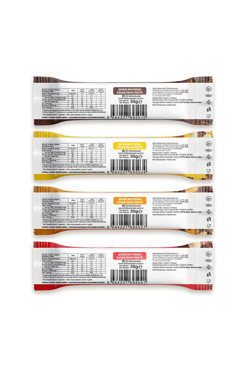Fellas Meyve Bar, koruyucu içermez, meyvelerin tatlılığıyla şekeri meyveden olarak üretilmiştir. Yüksek lif içerir. Vegan ve glutensizdir.