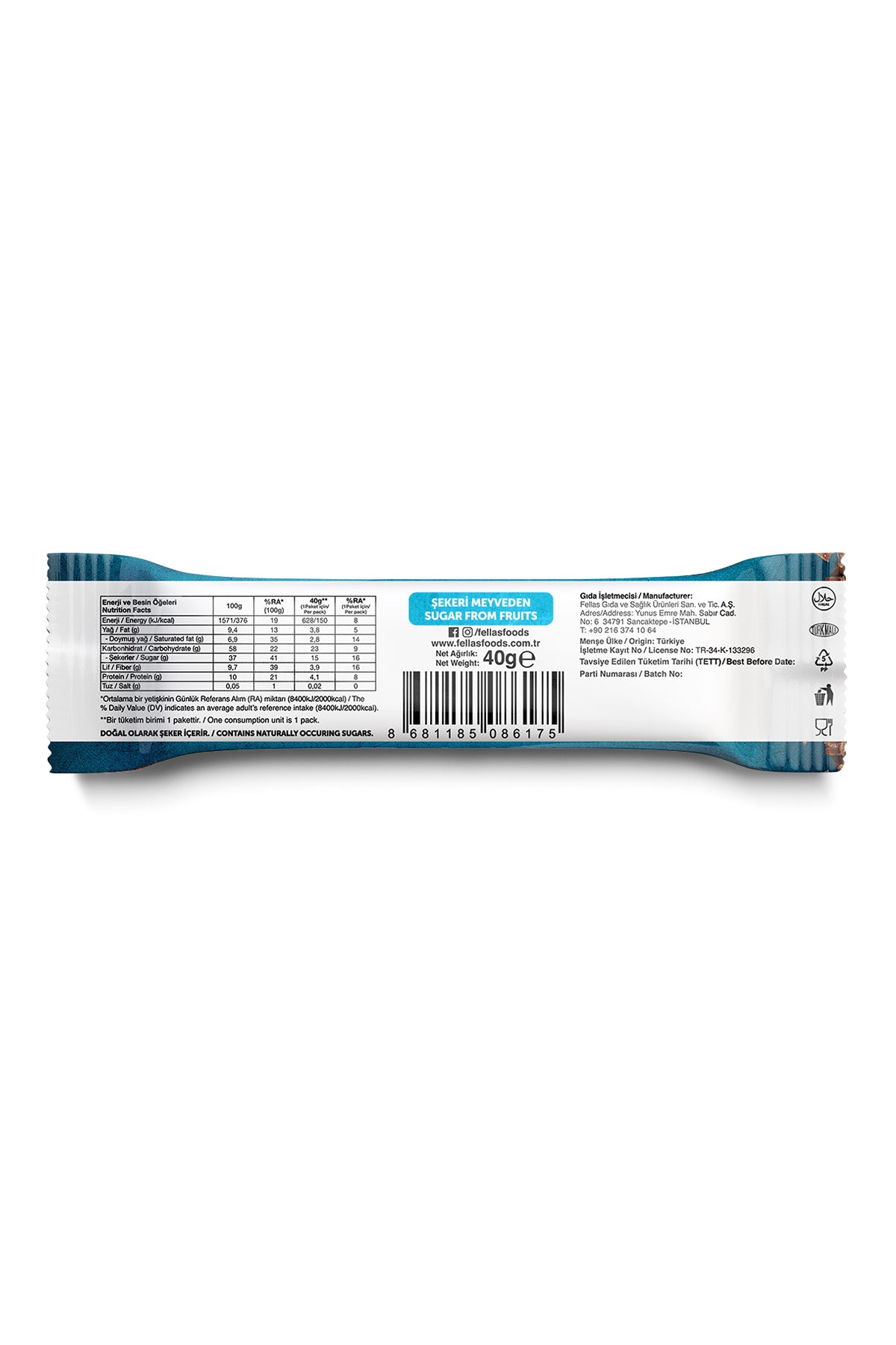 Fellas Meyve Bar, koruyucu içermez, meyvelerin tatlılığıyla şekeri meyveden olarak üretilmiştir. Yüksek lif içerir. Vegan ve glutensizdir.
