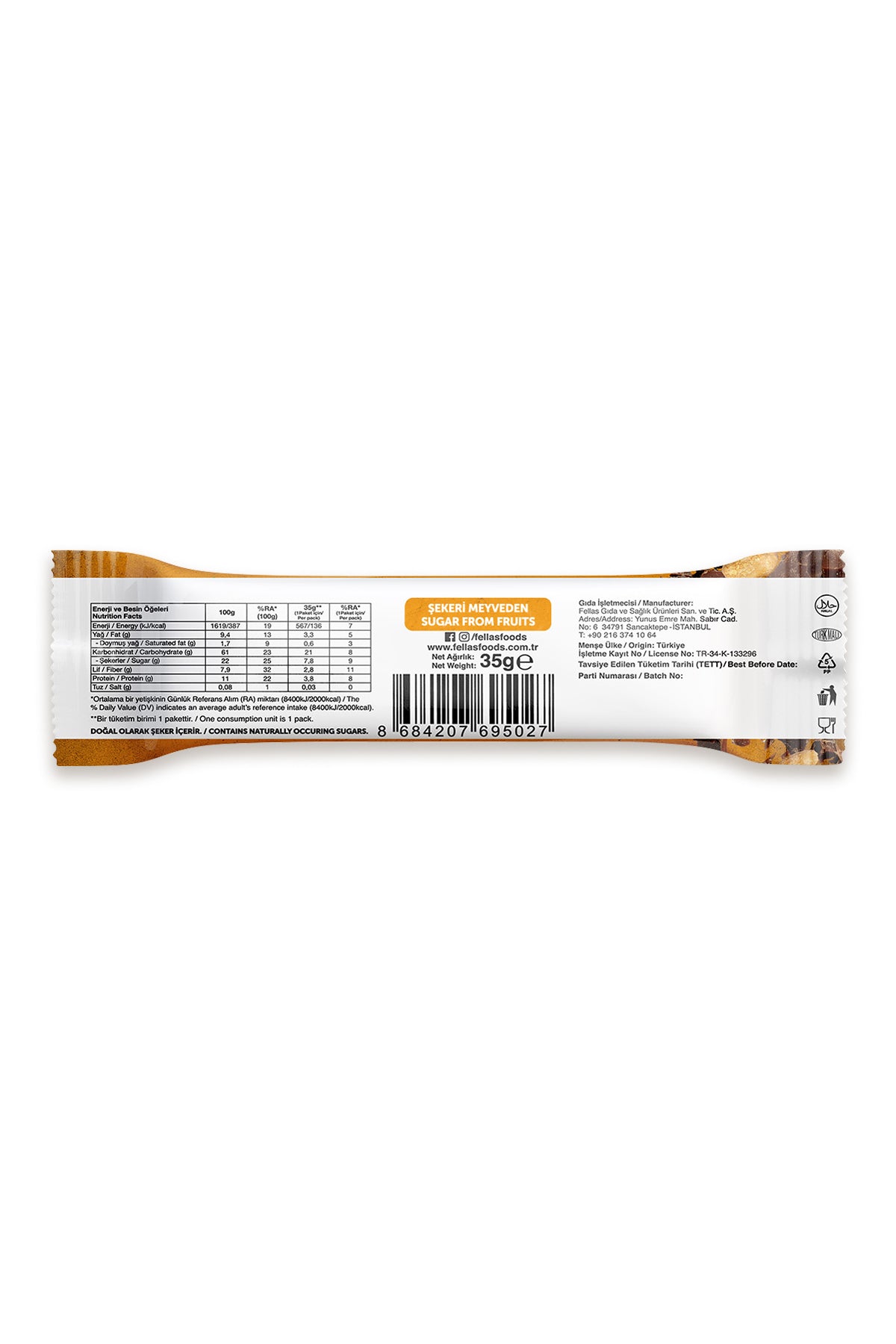 Fellas Meyve Bar, koruyucu içermez, meyvelerin tatlılığıyla şekeri meyveden olarak üretilmiştir. Yüksek lif içerir. Vegan ve glutensizdir.