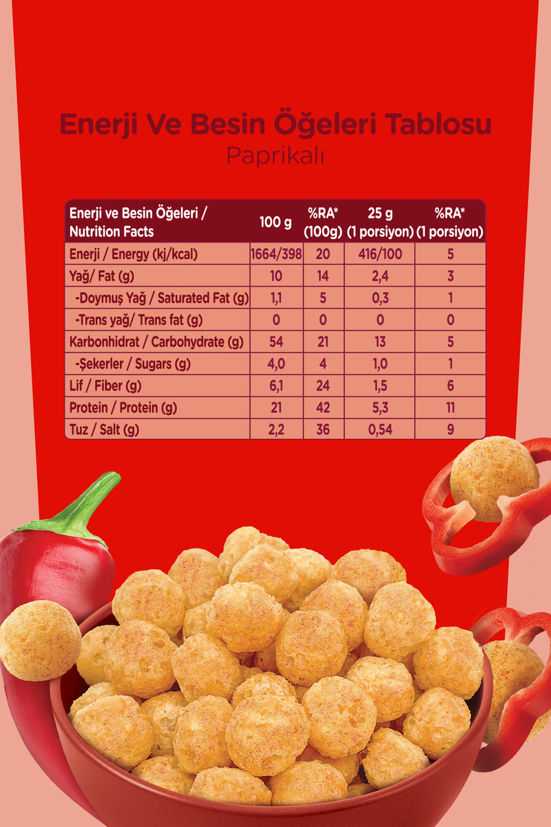 - Nohut unu (%49), pirinç unu, mercimek unu, bezelye proteini, paprika çeşnisi (%8) (paprika, soğan, sarımsak, kişniş, kimyon, tuz), bitkisel yağ (zeytinyağı, ayçiçek yağı).