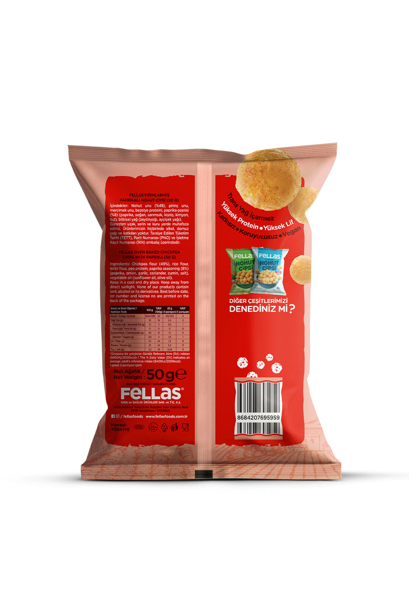 Yüksek lifli, katkısız, koruyucusuz Fellas Paprikalı Nohut Cipsi, lezzetten ödün vermeden, içeriğine güvenmek isteyenlerin yeni favorisi! Yüksek protein içeriğiyle enerji verirken, vegan ve fırınlanmış yapısıyla da dengeli ve lezzetli.