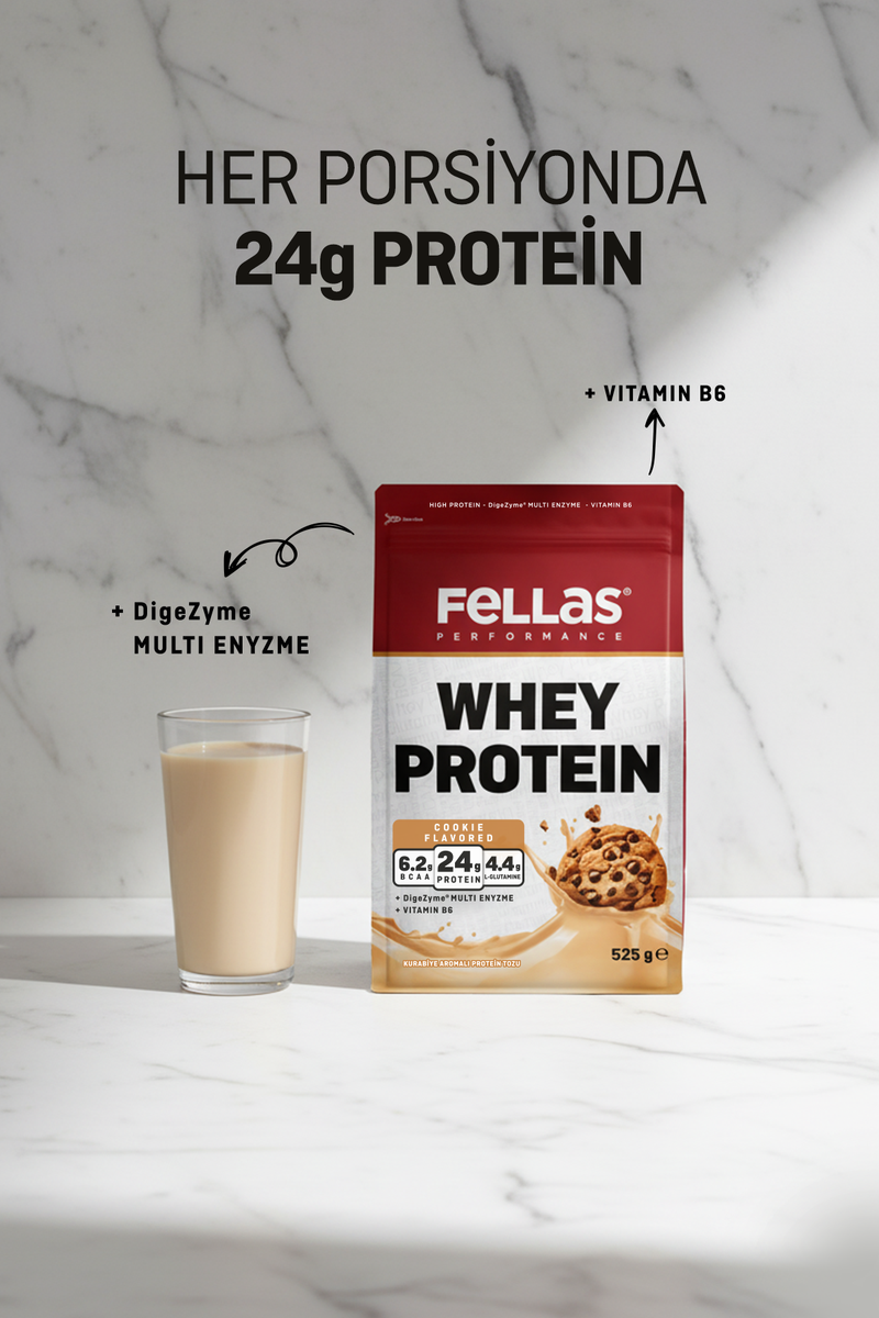 Fellas Performance Whey Protein Tozları; her porsiyonda 24g yüksek protein, 6.2g BCAA ve 4.4g L-Glutamine içerir. DigeZyme® multi enzim kompleksi ve Vitamin B6 ilaveli formülüyle öne çıkar. Çikolata ve kurabiye aromasıyla lezzetli bir protein desteği sunar.