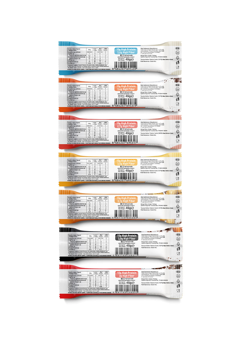 Hindistan Cevizli ve Kakaolu, Bademli ve Kakaolu, Yer Fıstıklı ve Kakaolu, Klasik, Portakallı ve Kakaolu, Çilekli, Muzlu Yüksek Protein Barlar bir arada! 24’lü ekonomik paket ile gün boyu pratik bir atıştırmalık elinizin altında!