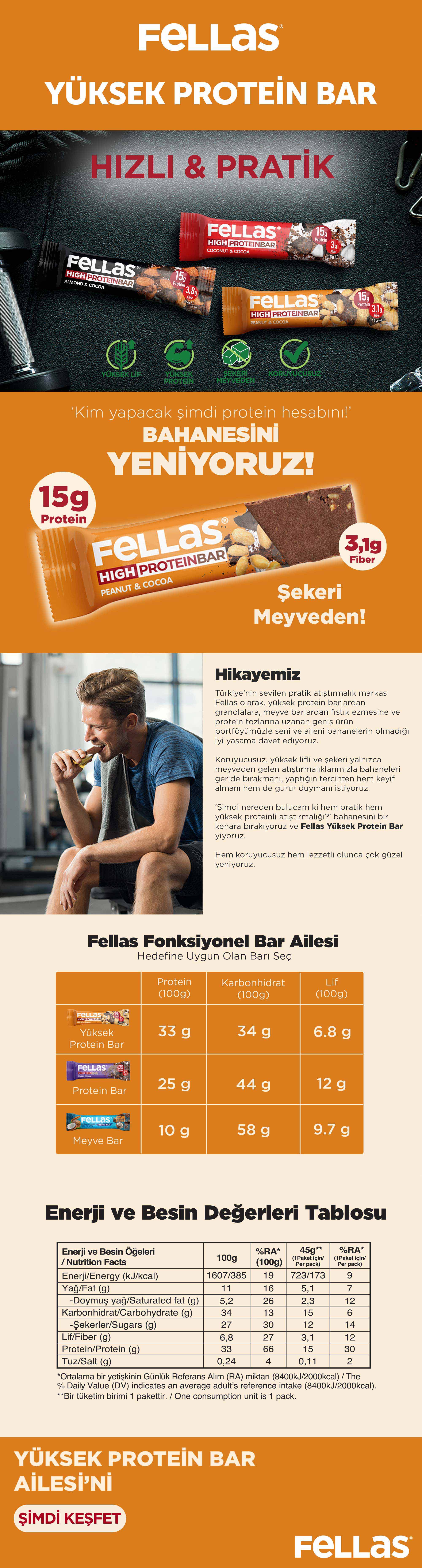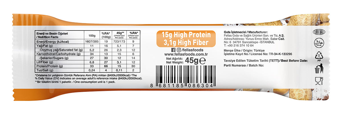 Egzersiz öncesi veya sonrasında yüksek proteinli bir atıştırmalık arıyorsan, Fellas Yüksek Protein Bar tam sana göre! 15 gram protein içeriği, glutensiz formülüyle, koruyucusuz ve şekeri meyveden yapısıyla spor rutinine eşlik eder!